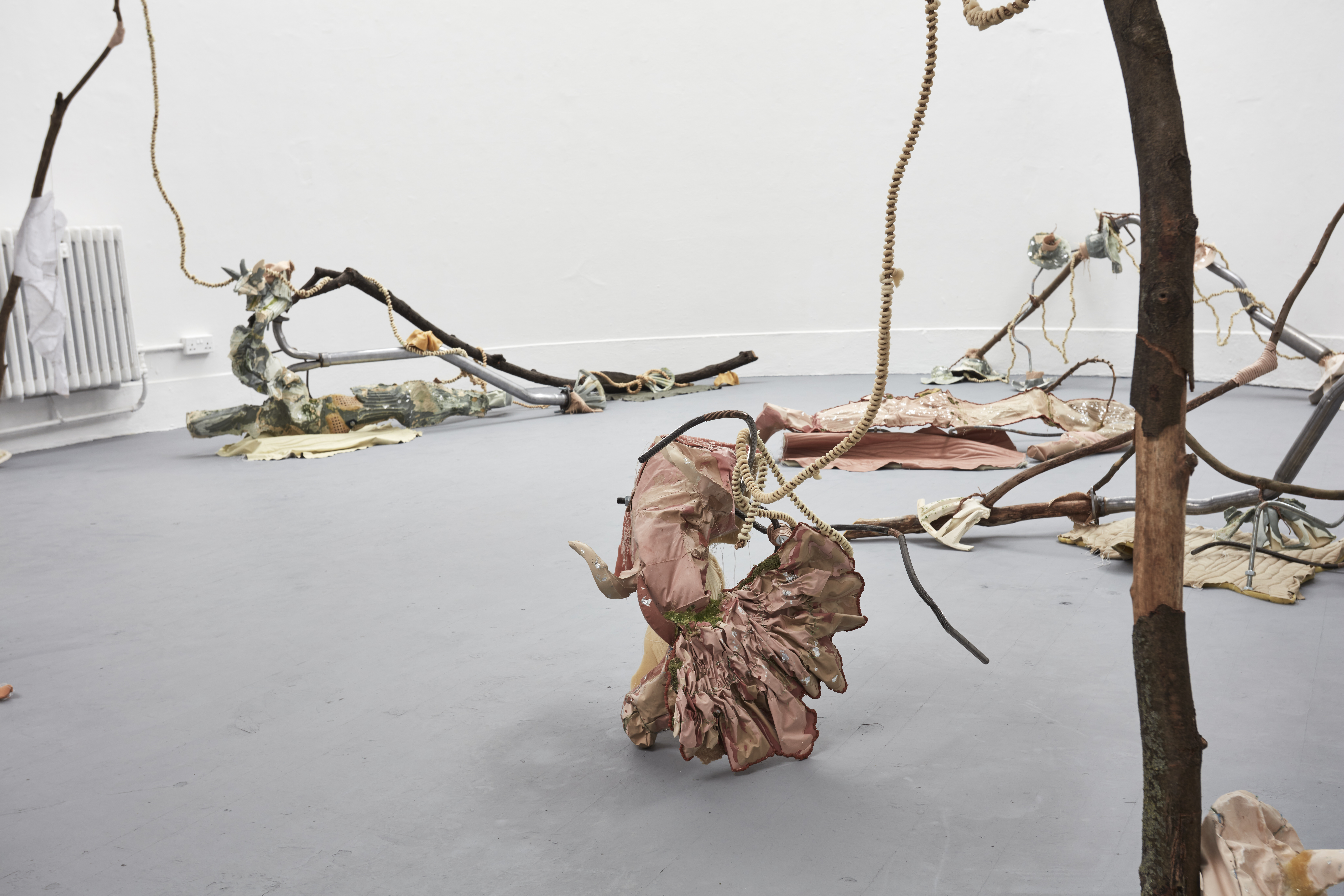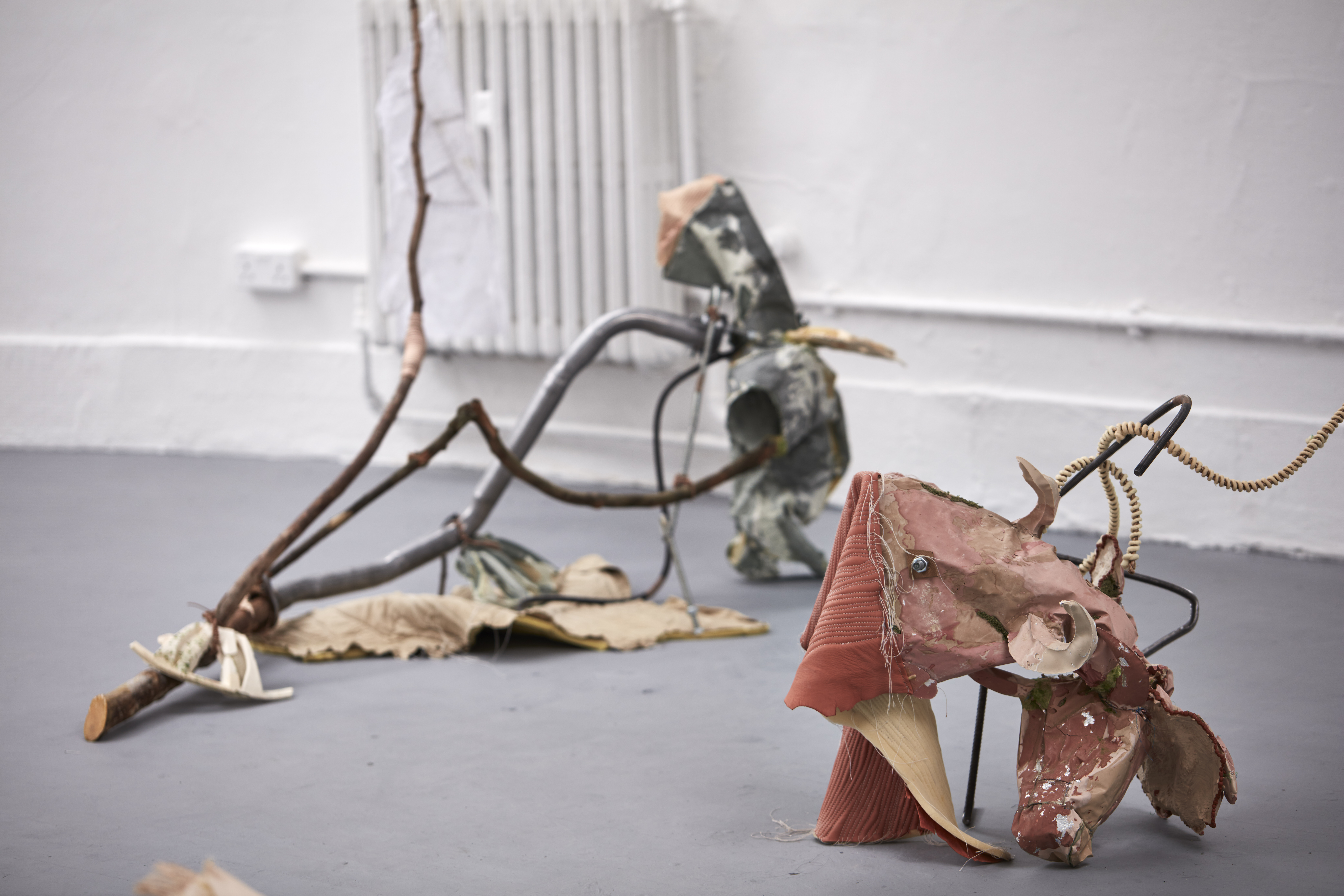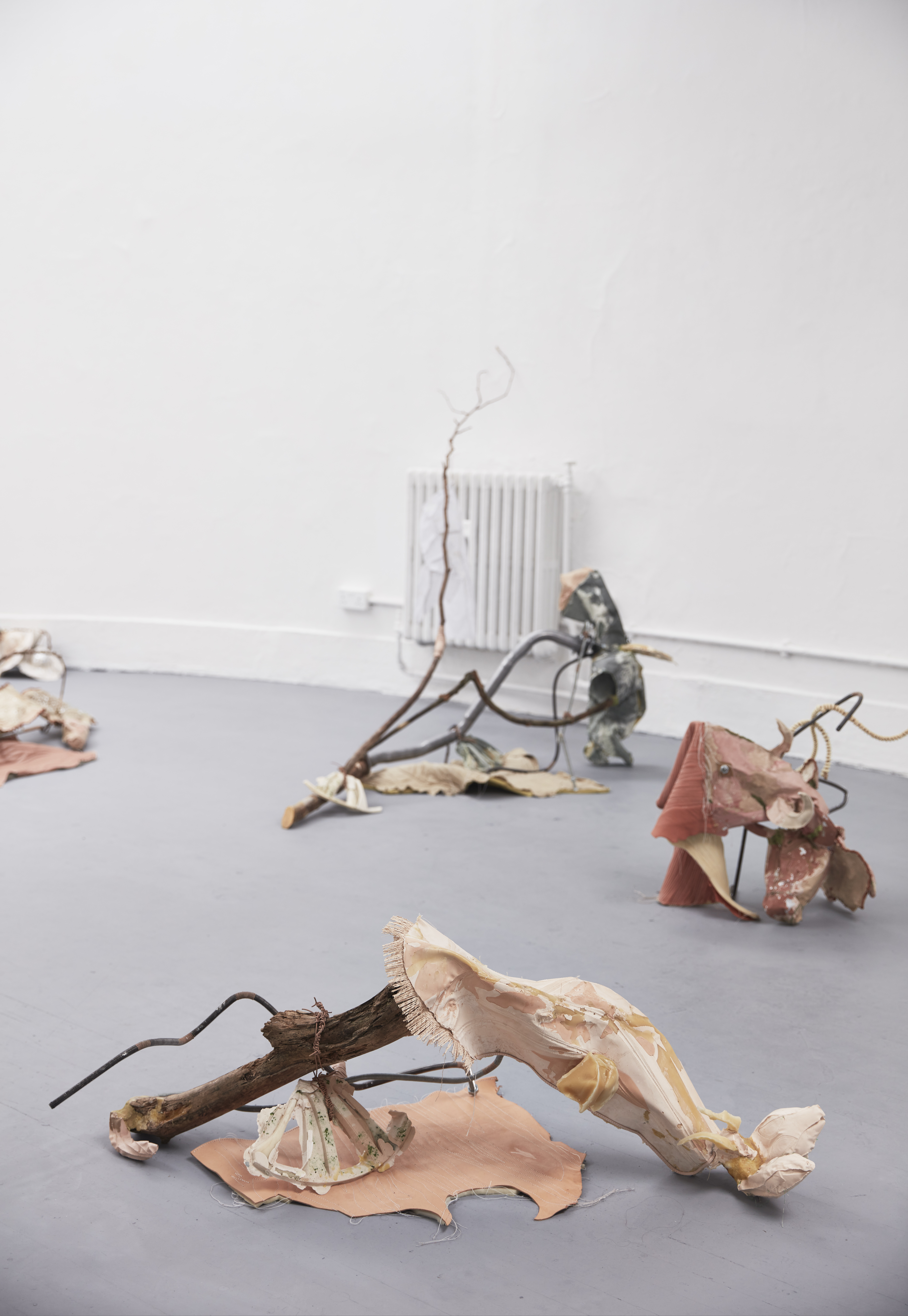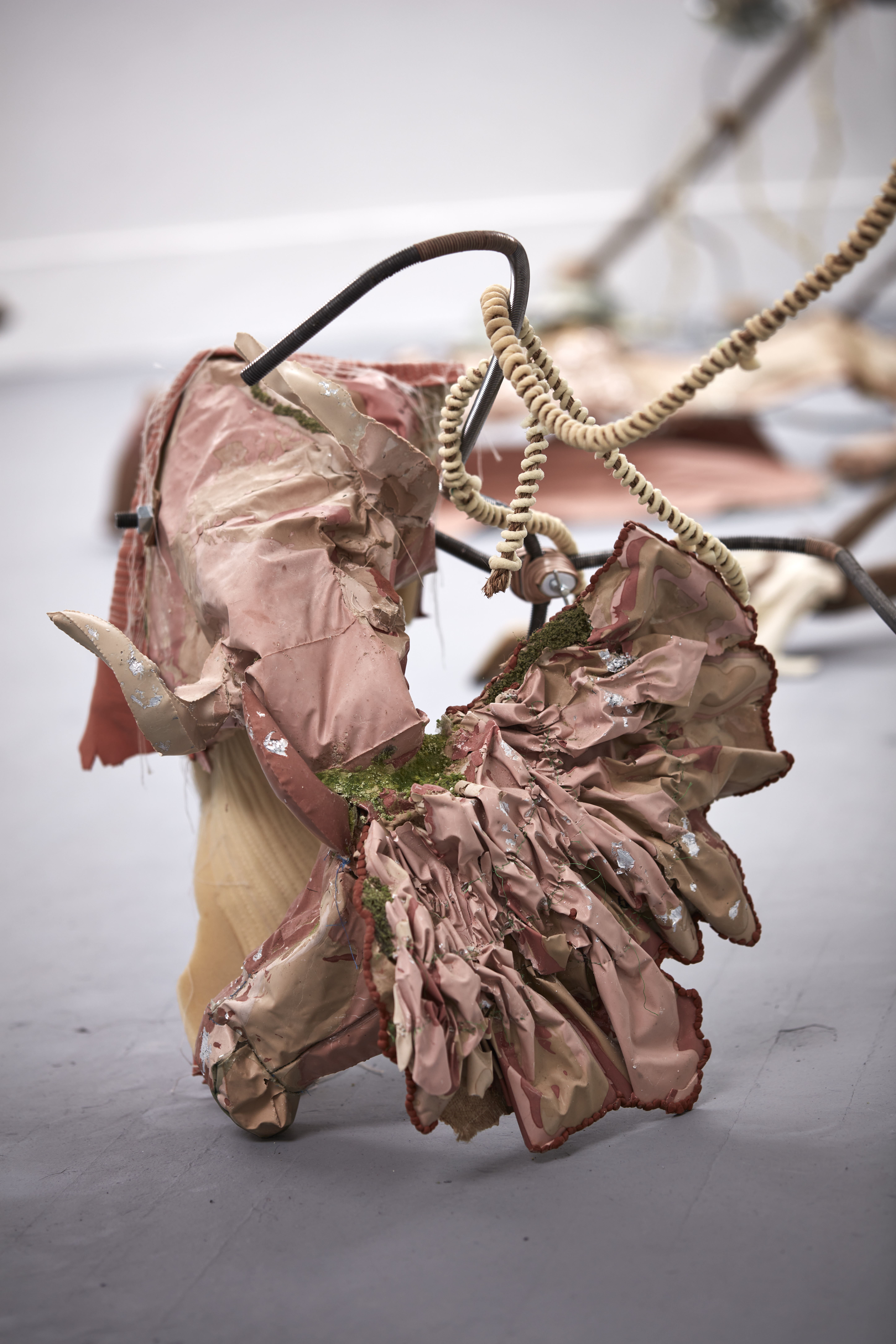 Jesmonite, beeswax, fabric, metal flake, grass-flock, epoxy clay, wood branch, yarn, leather, leather cord, rope, upholstery foam, threaded rod, nuts, clamp, exhaust pipe, pattern paper, dressmaking pin